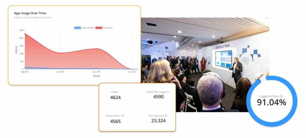 Wer EventMobi nutzt, hat Zugriff auf ein Dashboard mit detaillierten Nutzungsstatistiken, aus denen sich Erkenntnisse zu Interaktionsraten und zum Return on Investment der Veranstaltung ableiten lassen. All dies können Sie heranziehen, um zu bewerten, was wie funktioniert hat (und was nicht), sodass Sie in Zukunft noch erfolgreichere Hybridveranstaltungen auf die Beine stellen können.